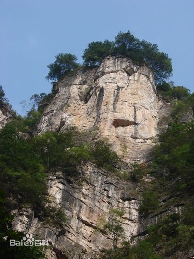 6、千佛岭:在苍翠林木掩映下,露出一块巨大的方一型石壁,岩面凹凸不平,有石笋和钟乳石渗杂其中,如一座众多佛像的神龛。